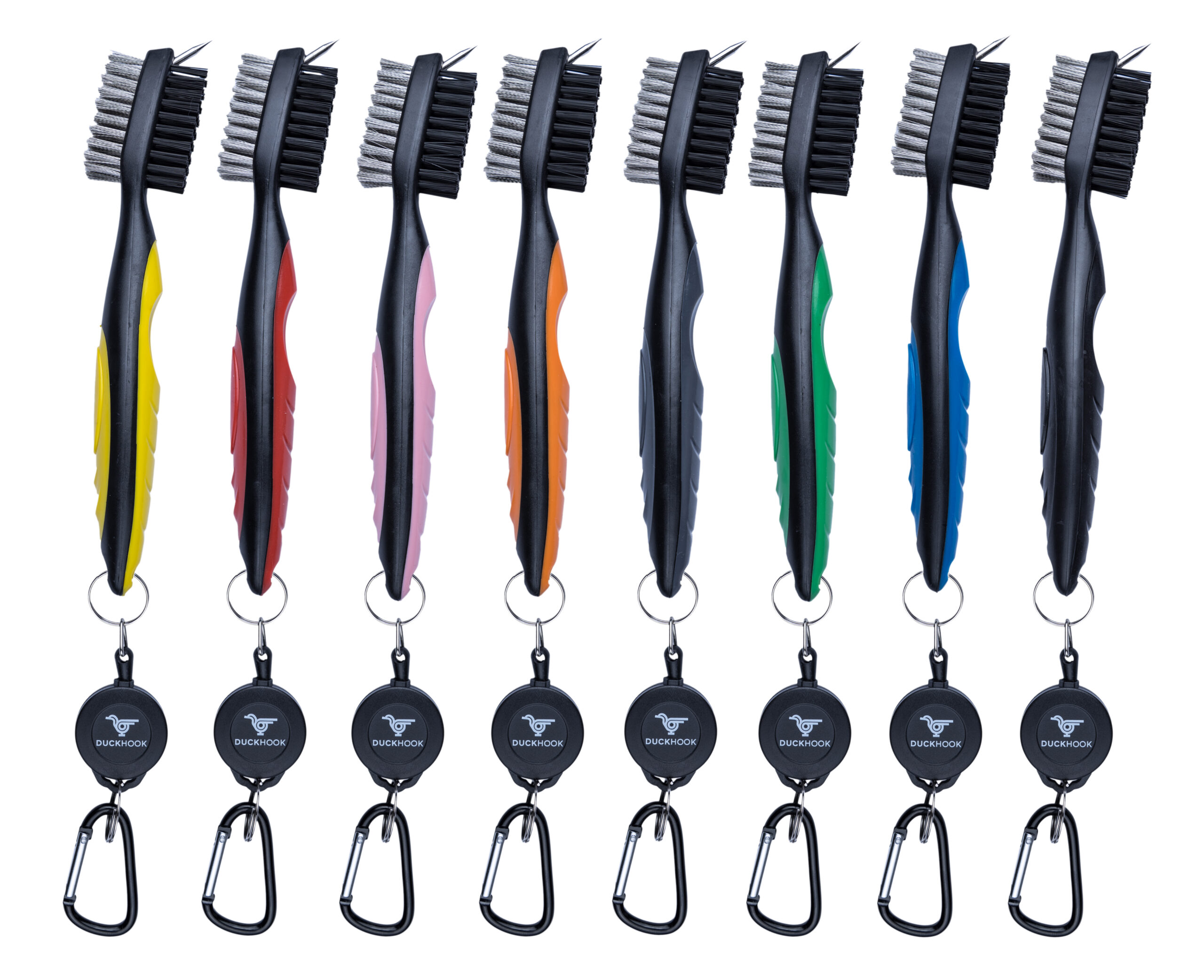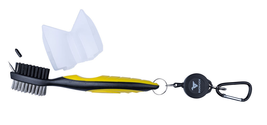 - Soft nylon bristles to clean woods/hybrids, hard steel wire bristles for cleaning irons and a metal spike to deep clean iron grooves and shoe spikes.