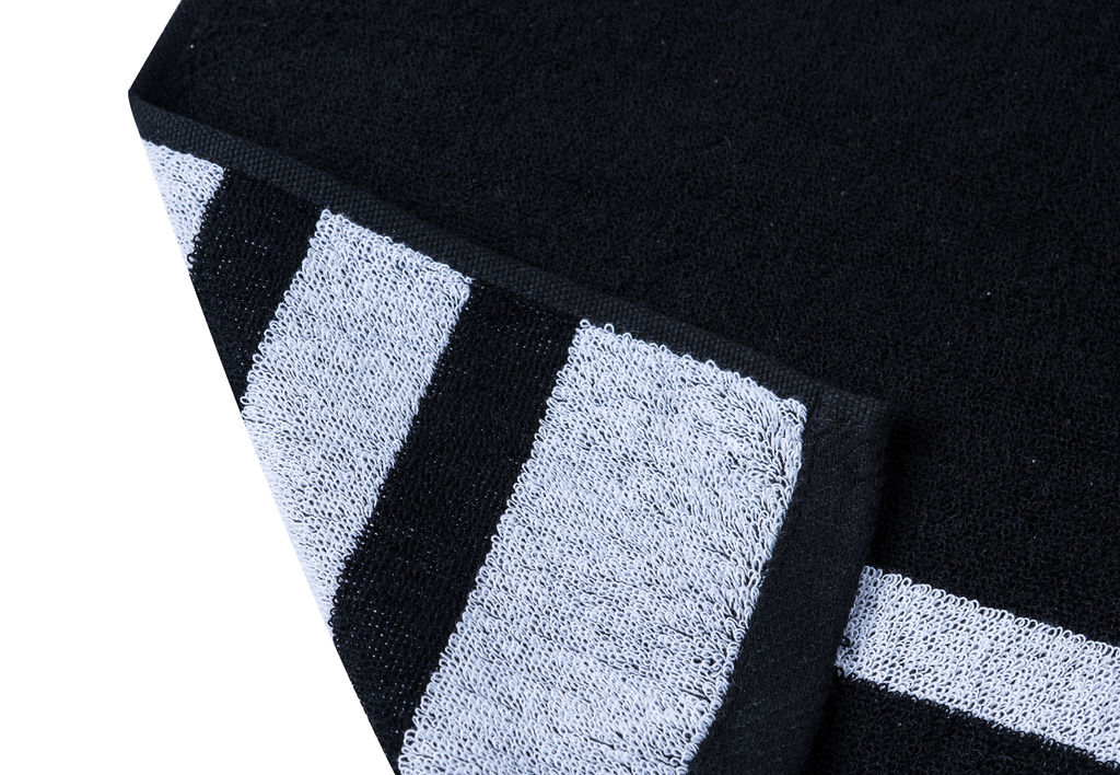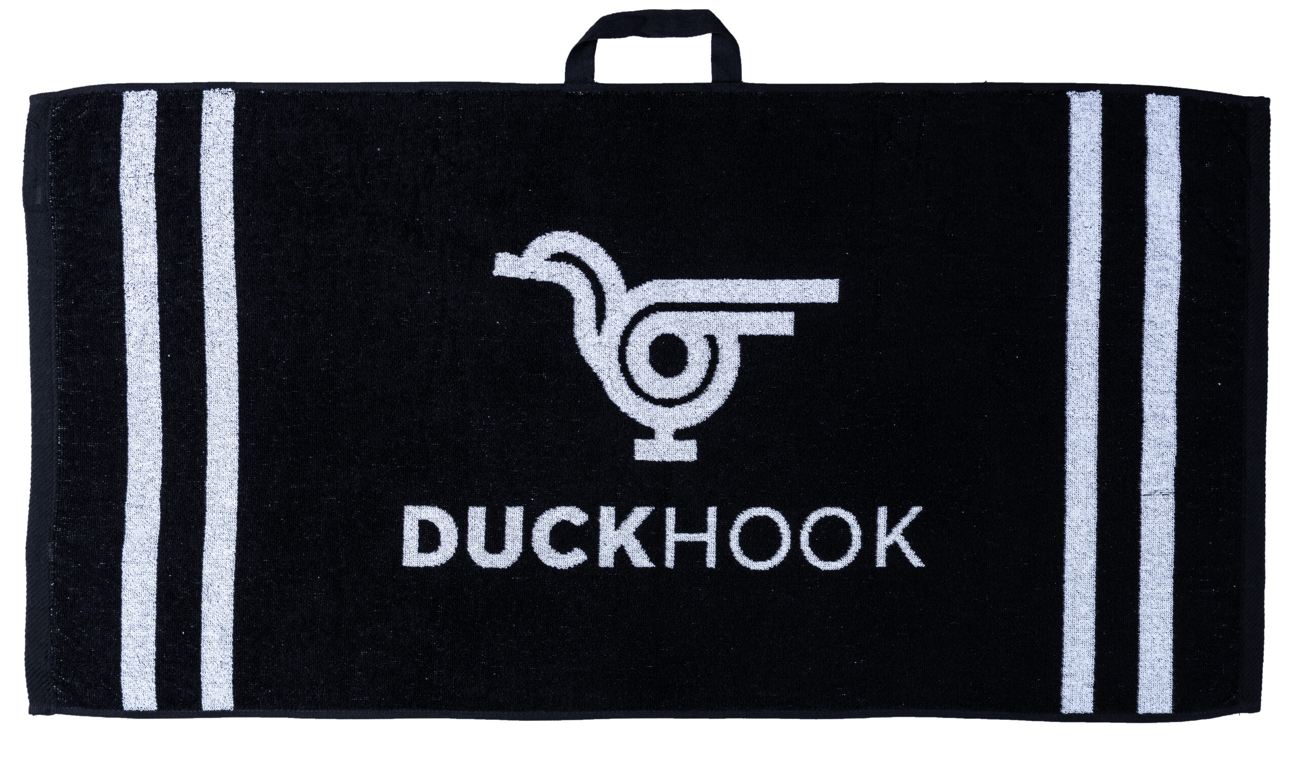 - Design: Black towel with white DuckHook logo/wording and white stripes. Opposite colours on the other side.