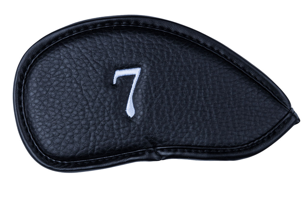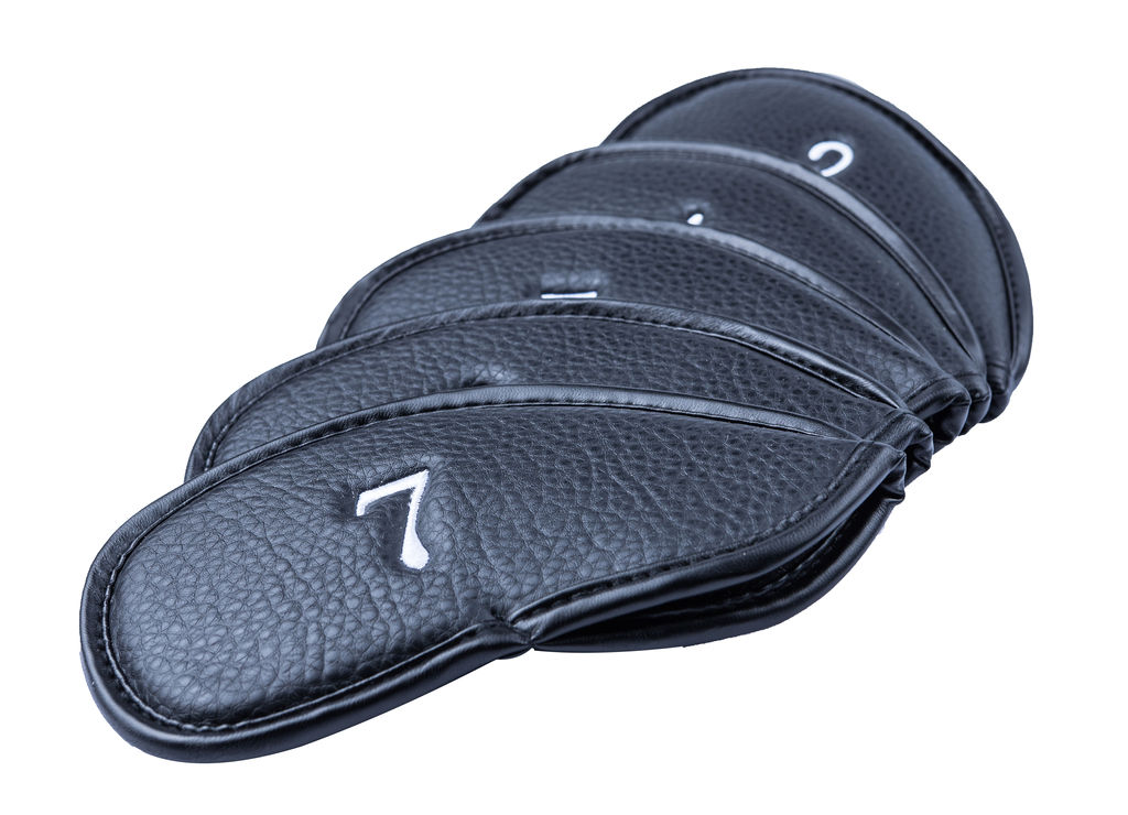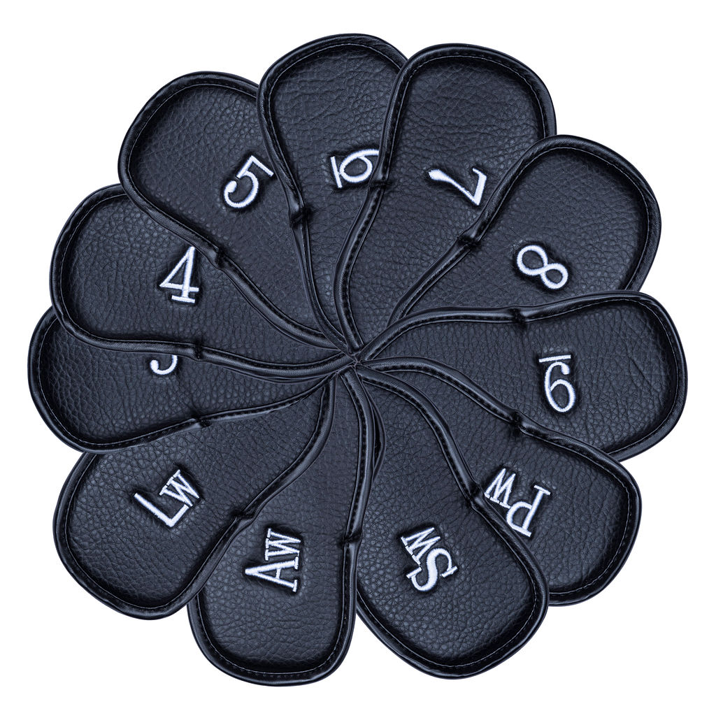 Black PU leather iron covers with white stitched numbers/letters. 12 piece set.